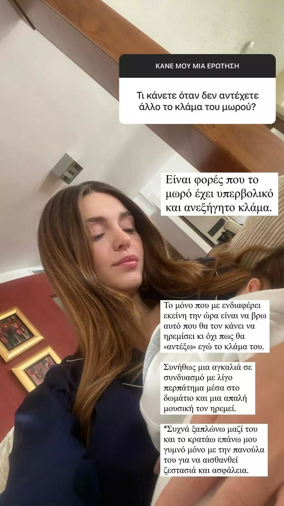 Επιπρόσθετα, η Ιωάννα Σιαμπάνη μίλησε και για τις στιγμές εκείνες που το κλάμα του μωρού της γίνεται υπερβολικό και τους τρόπους που έχει βρει εκείνη για να το ηρεμεί.