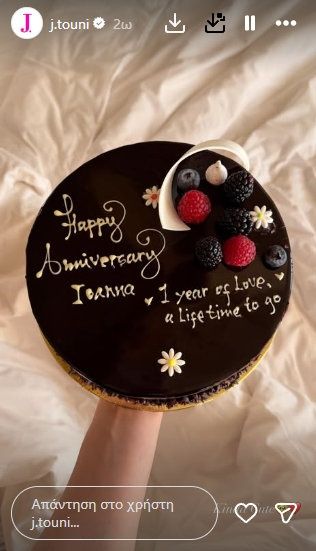 Ο Δημήτρης Σπυριδωνίδης φρόντισε να κάνει τη γιορτή τους μοναδική, προσφέροντάς της ένα υπέροχο μπουκέτο με κόκκινα τριαντάφυλλα, αλλά και μια σοκολατένια τούρτα που έκρυβε μέσα της μια ιδιαίτερη αφιέρωση. Στο γλυκό, ο ίδιος έγραψε με τρυφερότητα:
