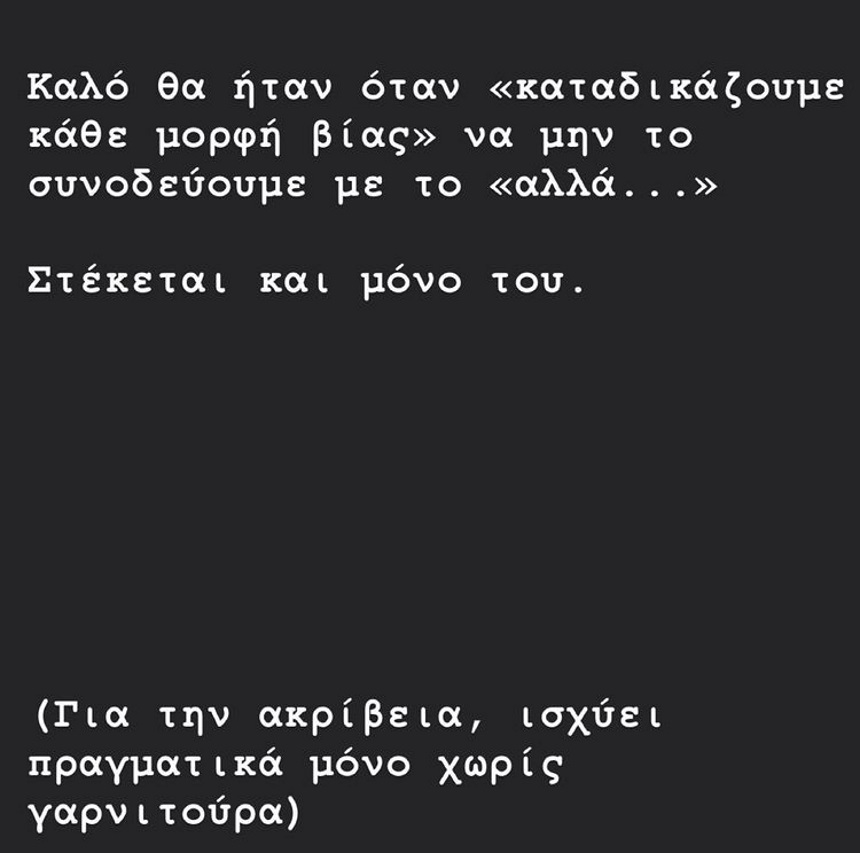 Αυτή τη φορά, η Ιωάννα Τριανταφυλλίδου θέλησε να εκφράσει τη διαφωνία της με εκείνους που, ναι μεν καταδικάζουν κάθε μορφή βίας, αλλά στις προτάσεις τους προσθέτουν και το “αλλά”.