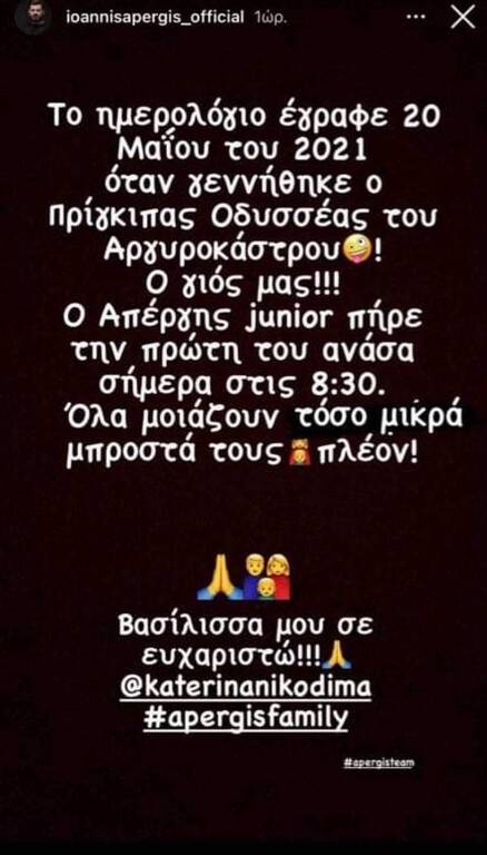 «Το ημερολόγιο έγραφε 20 Μάϊου 2021 όταν γεννήθηκε ο πρίγκιπας Οδυσσέας του Αργυρόκαστρου. Ο γιος μας!!! Ο Απέργης junior πήρε την πρώτη του ανάσα σήμερα στις 08.30. Όλα μοιάζουν τόσο μικρά μπροστά τους, πλέον!!»