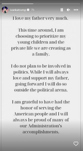 Η πρωτότοκη κόρη του Τραμπ ανέφερε στην ανακοίνωσή της στα Instagram Stories: «Αγαπώ πάρα πολύ τον πατέρα μου. Αυτή τη φορά επιλέγω να δώσω προτεραιότητα στα μικρά μου παιδιά και στην ιδιωτική ζωή που δημιουργούμε ως οικογένεια.