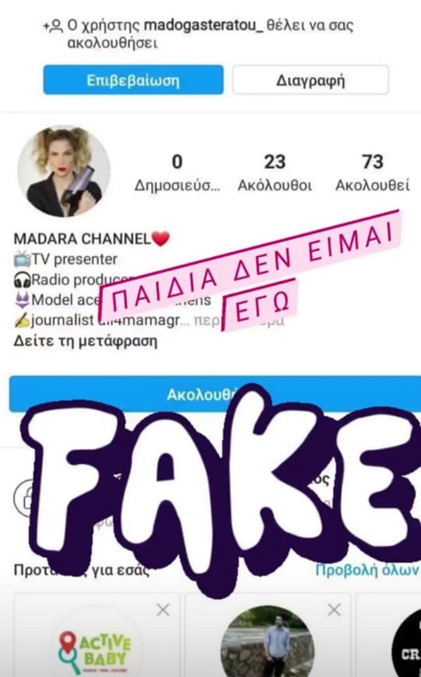 Αυτή τη φορά, η Μαντώ Γαστεράτου βρέθηκε στη δυσάρεστη θέση. Η παρουσιάστρια και ραδιοφωνική παραγωγός εντόπισε στο Instagram ένα προφίλ που χρησιμοποιεί τις φωτογραφίες και τα στοιχεία της χωρίς, βέβαια, να είναι η ίδια. Η Μαντώ Γαστεράτου έσπευσε να ειδοποιήσει τους ακόλουθούς της γράφοντας: “Παιδιά δεν είμαι εγώ. Fake”.