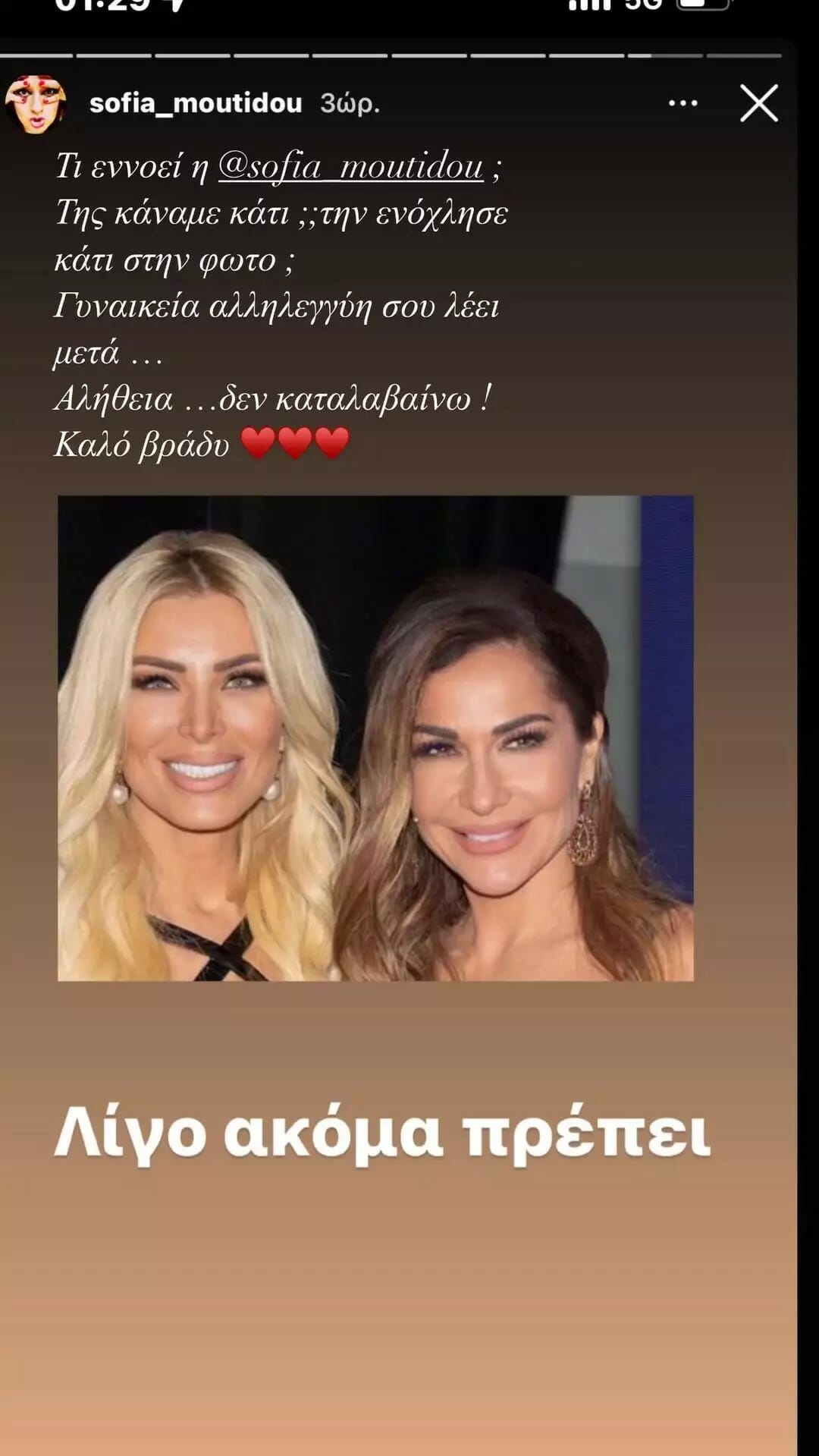 «Μόλις είδα μια απάντηση της Κατερίνας Καινούργιου, και απάντησα και εγώ με δικό μου story. Λέει, «Τι εννοεί η Σοφία Μουτίδου; Της κάναμε κάτι: Την ενόχλησε κάτι στην φώτο; Γυναικεία αλληλεγγύη σου λέει μετά. Αλήθεια δεν καταλαβαίνω. Καλό βράδυ». Εγώ δεν καταλαβαίνω. Εγώ έγραψα, “λίγο ακόμα πρέπει”. Το μυαλό σας που πήγε εσάς; Ποια αλληλεγγύη; Δεν καταλαβαίνω τίποτα. Λέξη δεν καταλαβαίνω.