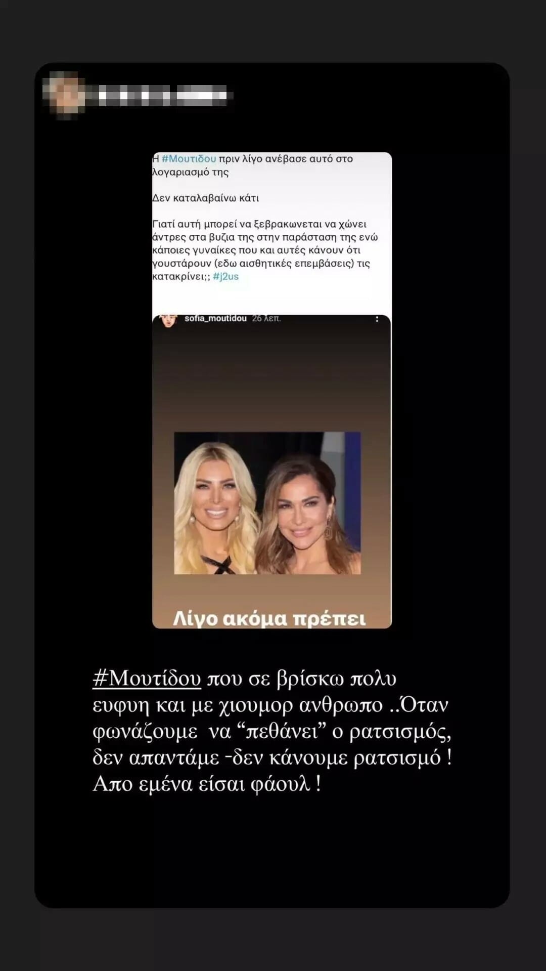 Λίγο αργότερα η παρουσιάστρια του Alpha προχώρησε σε μια νέα ανάρτηση αναδημοσιεύοντας το σχόλιο ενός άλλου χρήστη του διαδικτύου το οποίο ανέφερε: «Η Μουτίδου πριν λίγο ανέβασε αυτό στον λογαριασμό της. Δεν καταλαβαίνω κάτι. Γιατί αυτή μπορεί να ξεβρακώνεται, να χώνει άντρες στα βυζι@ της στην παράστασή της ενώ κάποιες γυναίκες που και αυτές κάνουν ότι γουστάρουν (εδώ αισθητικές επεμβάσεις) τις κατακρίνει;» και συμπλήρωσε την ανάρτηση με το δικό της εξής σχόλιο: «Μουτίδου που σε βρίσκω πολύ ευφυή και με χιούμορ άνθρωπο, όταν φωνάζουμε “να πεθάνει ο ρατσισμός” δεν απαντάμε-κάνουμε ρατσισμό. Από εμένα είναι φάουλ».