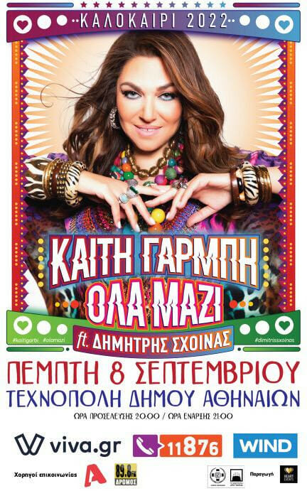 Συνεχίζοντας τη μεγάλη, sold out, καλοκαιρινή περιοδεία της, «Όλα Μαζί», σε όλη την Ελλάδα και την Κύπρο, η Καίτη Γαρμπή έρχεται για μία τρίτη συναυλία στην Αθήνα και, σίγουρα, θα «μαγέψει» όπως πάντα το κοινό.