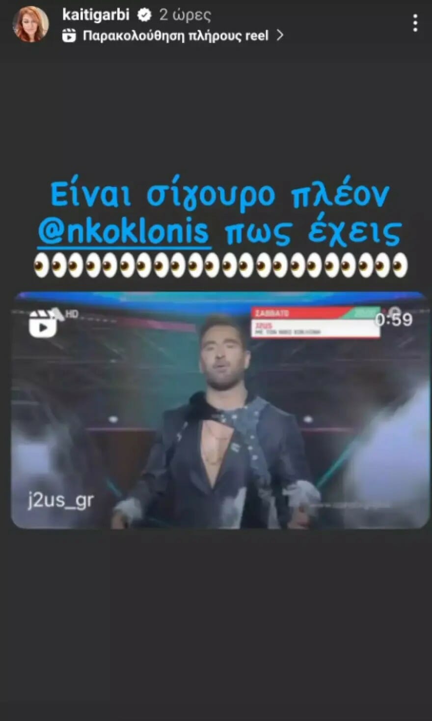 Η τραγουδίστρια Καίτη Γαρμπή και κριτής του τηλεοπτικού σόου το οποίο παρουσιάζει ο Νίκος Κοκλώνης, «Just the 2 of Us» δημοσίευσε βίντεο στον προσωπικό της λογαριασμό στο Instagram μέσω story.