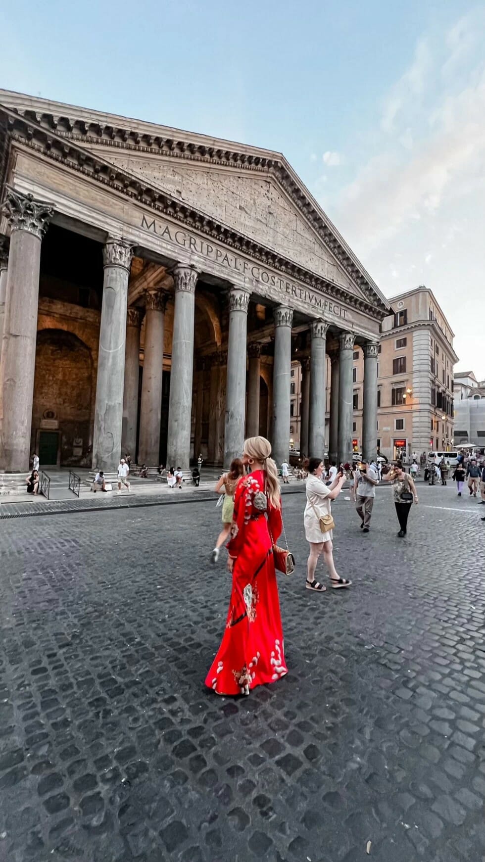 Σε ένα από τα φωτογραφικά στιγμιότυπα που ανάρτησε στα κοινωνικά δίκτυα, πόζαρε μπροστά από το εντυπωσιακό Πάνθεον, στην Πιάτσα ντε λα Ροτόντα. Επέλεξε ένα κόκκινο maxi φόρεμα για τη βόλτα της.