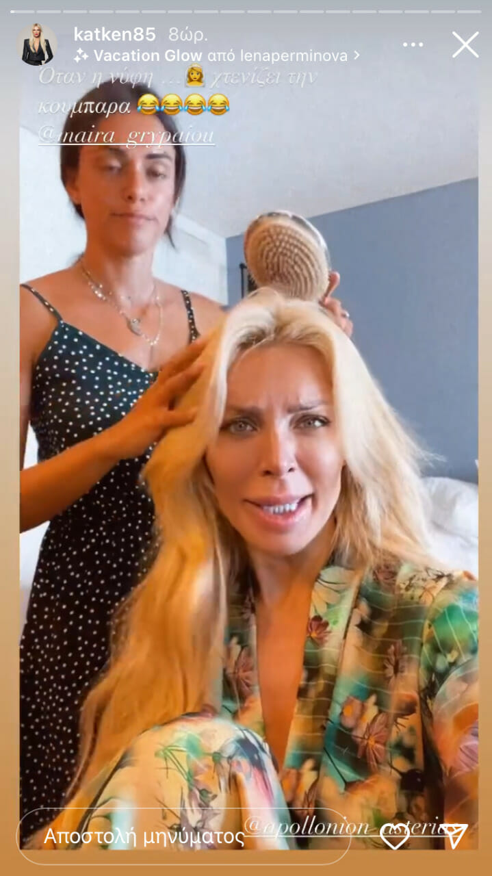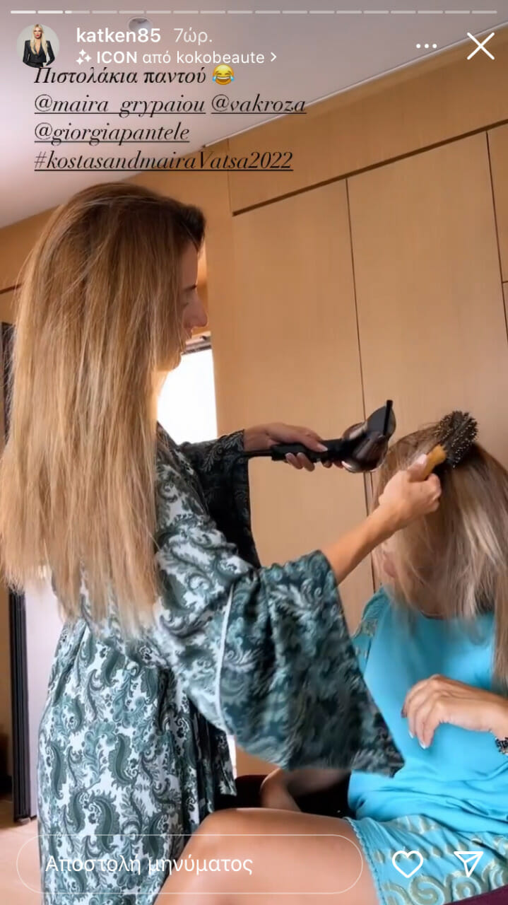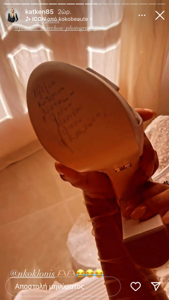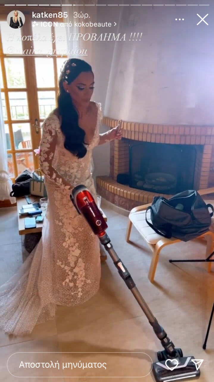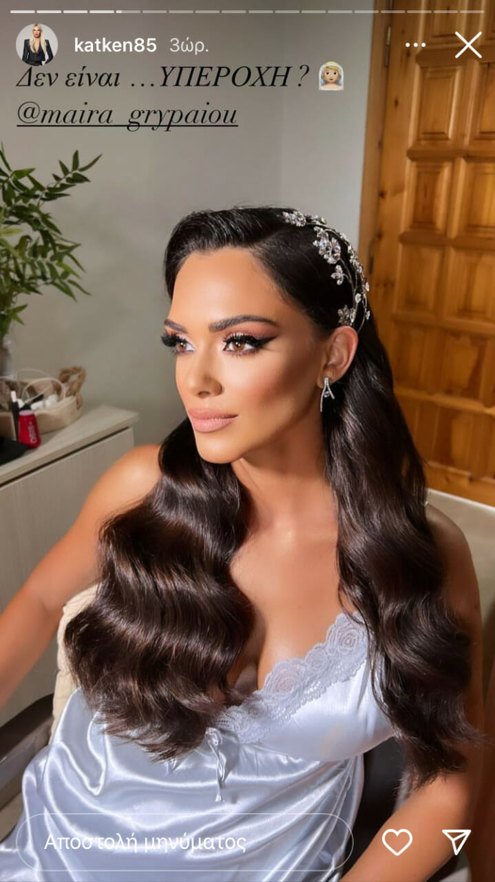 Η νύφη περιποιήθηκε την κουμπάρα της πριν να φορέσει το νυφικό της. Αφού ανέλαβε να επιμεληθεί τα μαλλιά της ακόμη και την ημέρα του γάμου της. Ενώ στη συνέχεια πήγε για να ετοιμαστεί και η ίδια. Και το αποτέλεσμα της προετοιμασίας της ήταν συγκλονιστικό, αφού έλαμπε με το νυφικό της. Ενώ δεν παρέλειψε να γράψει τα ονόματα κάτω από τα νυφικά της παπούτσια τηρώντας το έθιμο. Ακόμη και της Κατερίνας Καινούργιου.