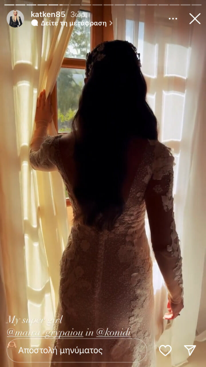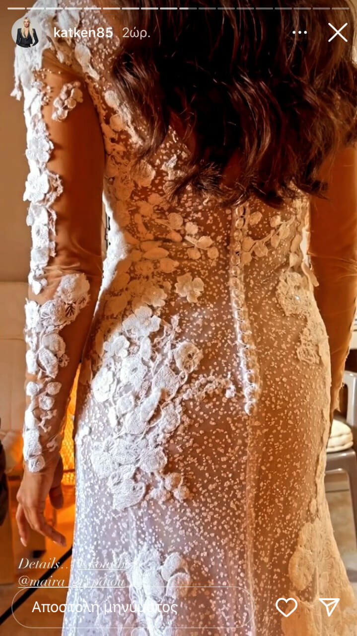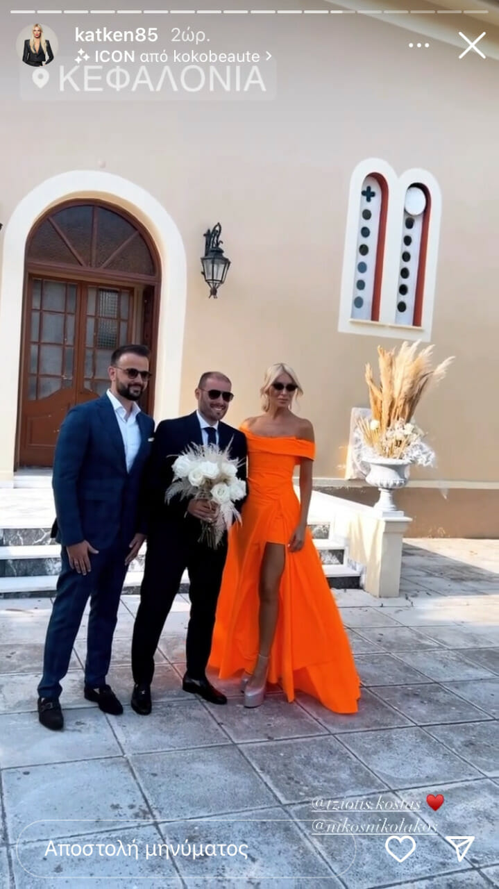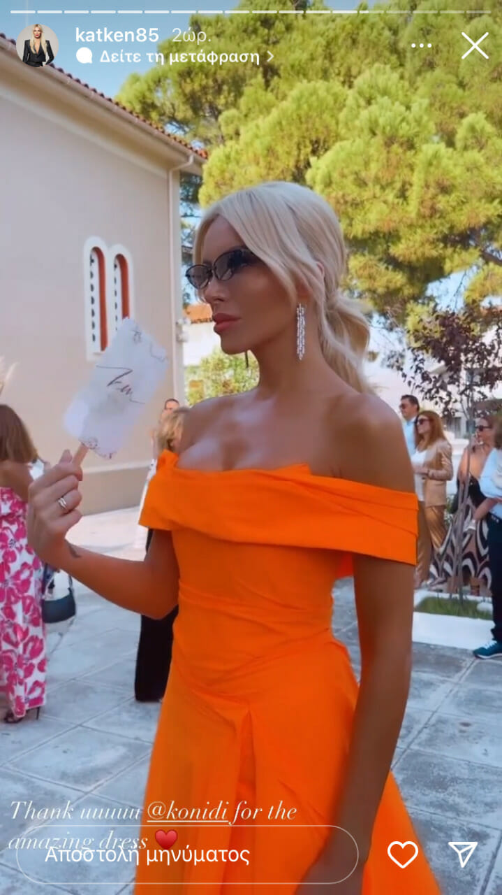 Η Κατερίνα Καινούργιου δημοσίευσε πλούσιο υλικό από τον γάμο και την προετοιμασία της νύφης στον λογαριασμό της στο Instagram. Φορώντας ένα εντυπωσιακό φόρεμα της MKonidi, με off shoulder σχέδιο σε έντονο πορτοκαλί χρώμα που αναδείκνυε το μαύρισμά της από τον ήλιο. Το εντυπωσιακό νυφικό της Μάιρας Γρυπαίου ήταν της ίδιας σχεδιάστριας.