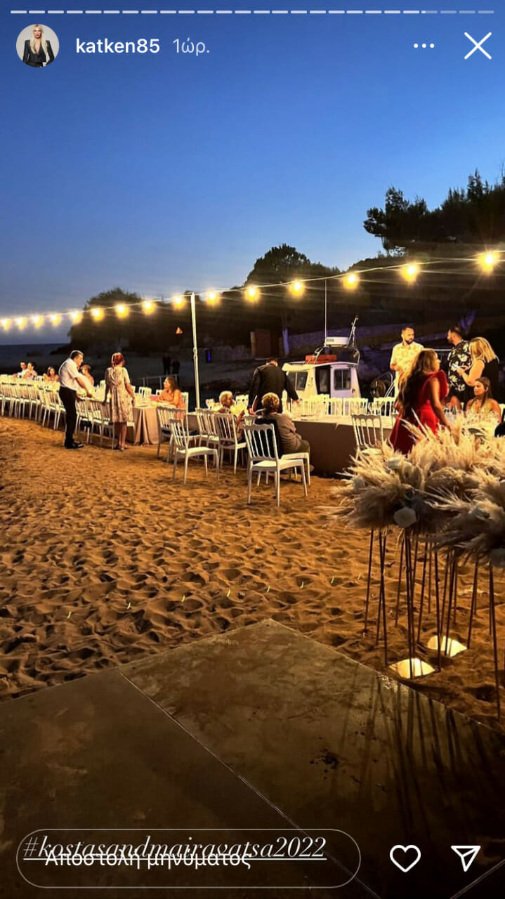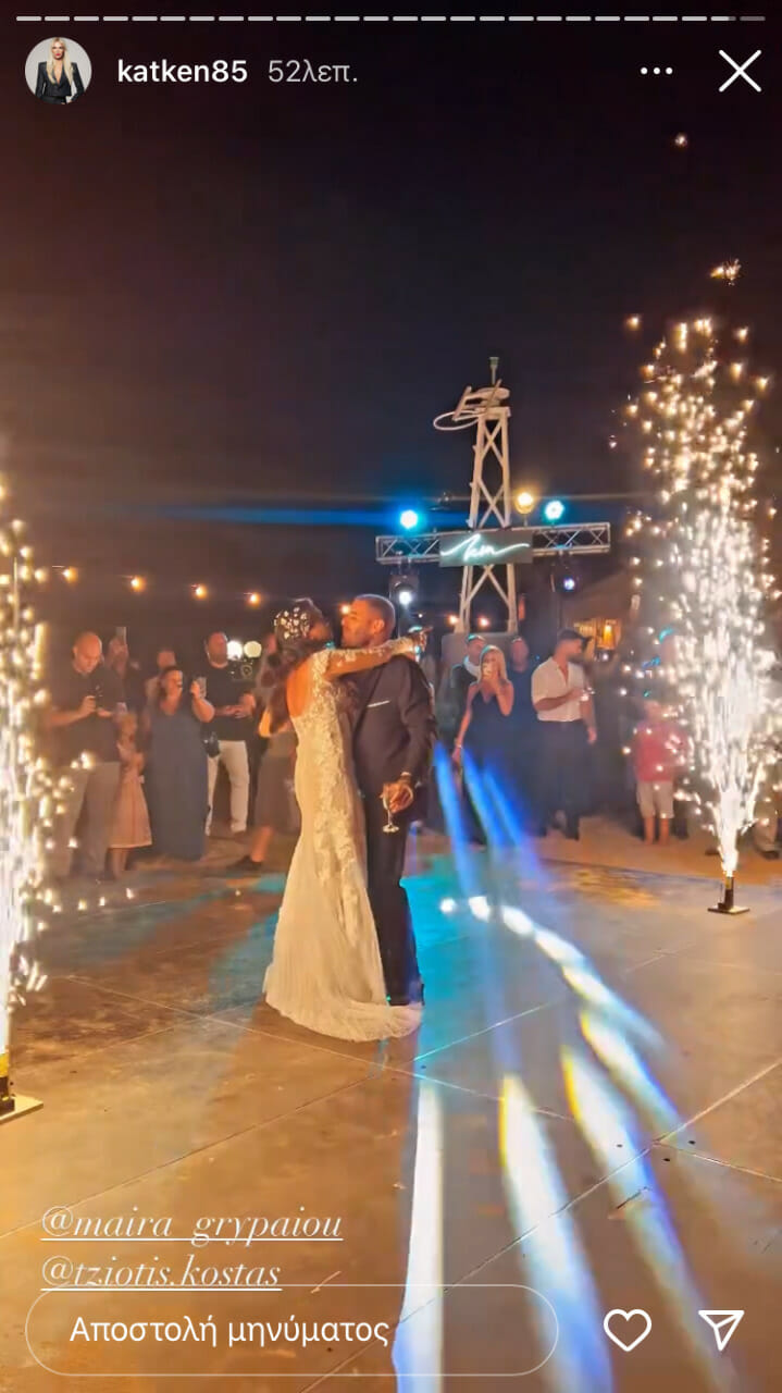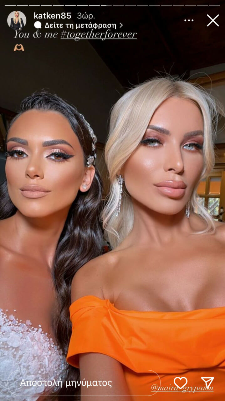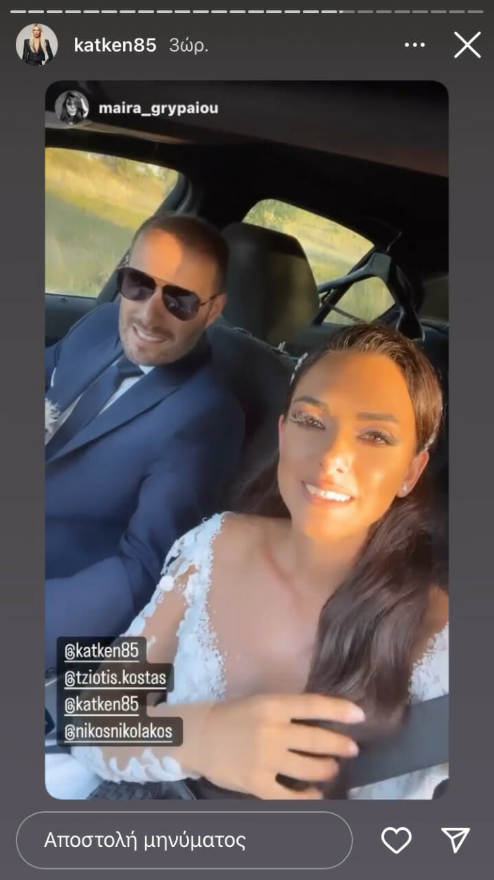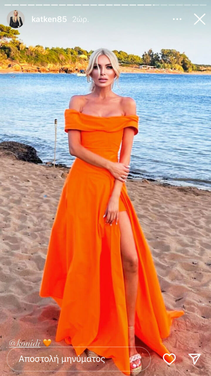Η Κατερίνα Καινούργιου δημοσίευσε πλούσιο υλικό από τον γάμο και την προετοιμασία της νύφης στον λογαριασμό της στο Instagram. Φορώντας ένα εντυπωσιακό φόρεμα της MKonidi, με off shoulder σχέδιο σε έντονο πορτοκαλί χρώμα που αναδείκνυε το μαύρισμά της από τον ήλιο. Το εντυπωσιακό νυφικό της Μάιρας Γρυπαίου ήταν της ίδιας σχεδιάστριας.