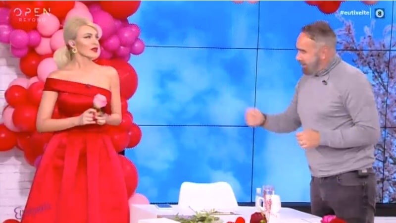 Η παρουσιάστρια αρχικά είπε: «Εμείς εδώ στο “Ευτυχείτε” είπαμε να το ζήσουμε λίγο.  Καλά δεν κάναμε;» με τον Γρηγόρη αμέσως να της δίνει τα τριαντάφυλλα και να λέει: «Αυτό είναι από τον Φίλιππο, αυτό είναι από μένα. Τα υπόλοιπα την Κυριακή».