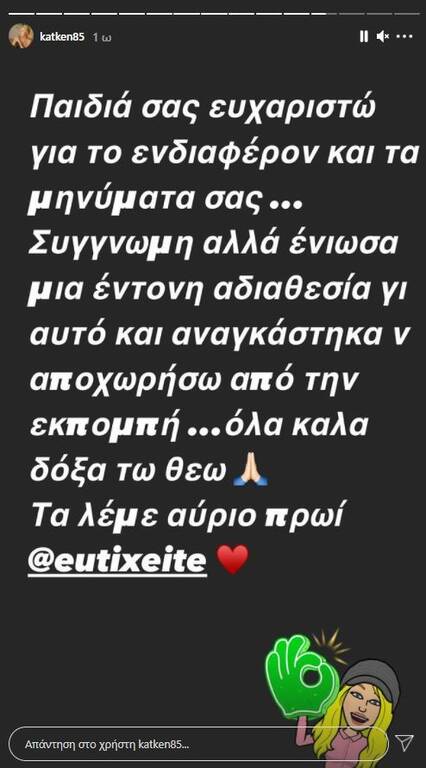 «Παιδιά σας ευχαριστώ για το ενδιαφέρον και τα μηνύματά σας… Συγγνώμη αλλά ένιωσα μια έντονη αδιαθεσία γι’ αυτό και αναγκάστηκα να αποχωρήσω από την εκπομπή… Όλα καλά δόξα τω Θεώ! Τα λέμε αύριο το πρωί!», έγραψε χαρακτηριστικά στο story της.