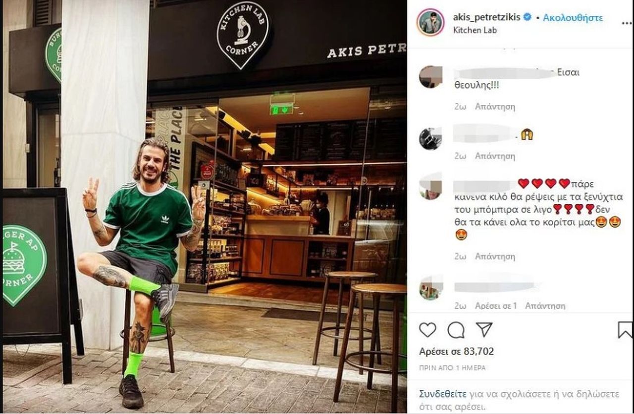 Όπως φαίνεται στην ανάρτησή του, ο Άκης Πετρετζίκης κάθεται φορώντας καλοκαιρινά ρούχα. Κάνει το σήμα της νίκης έξω από το μαγαζί του ενώ έχει αδυνατίσει πολύ. Και έχει αφήσει τα μαλλιά του να μακρύνουν.