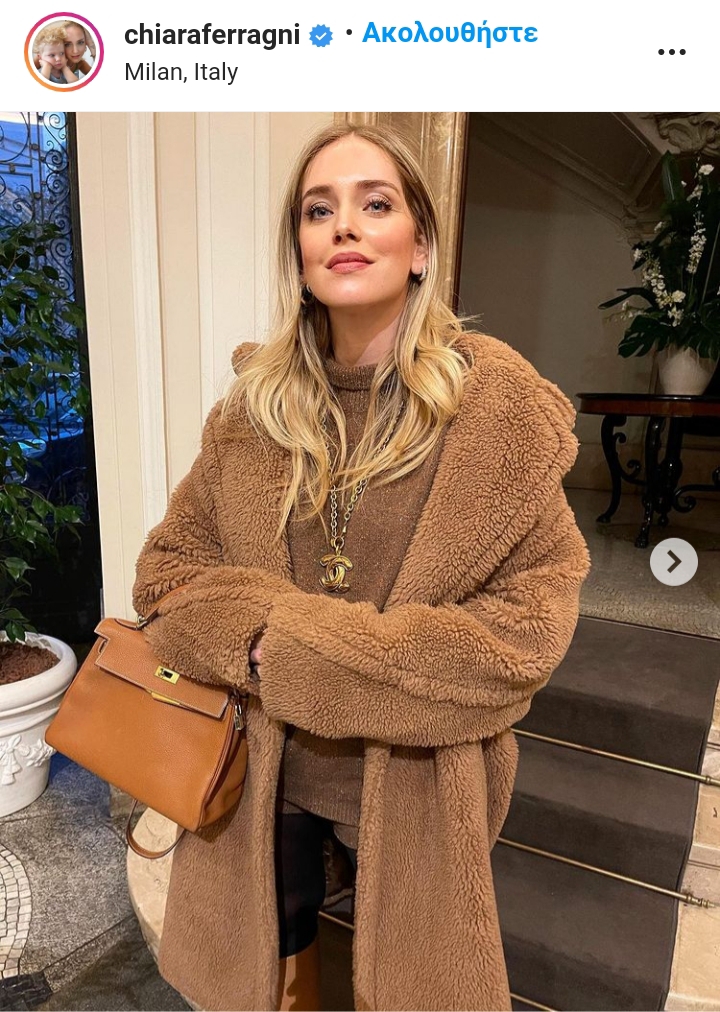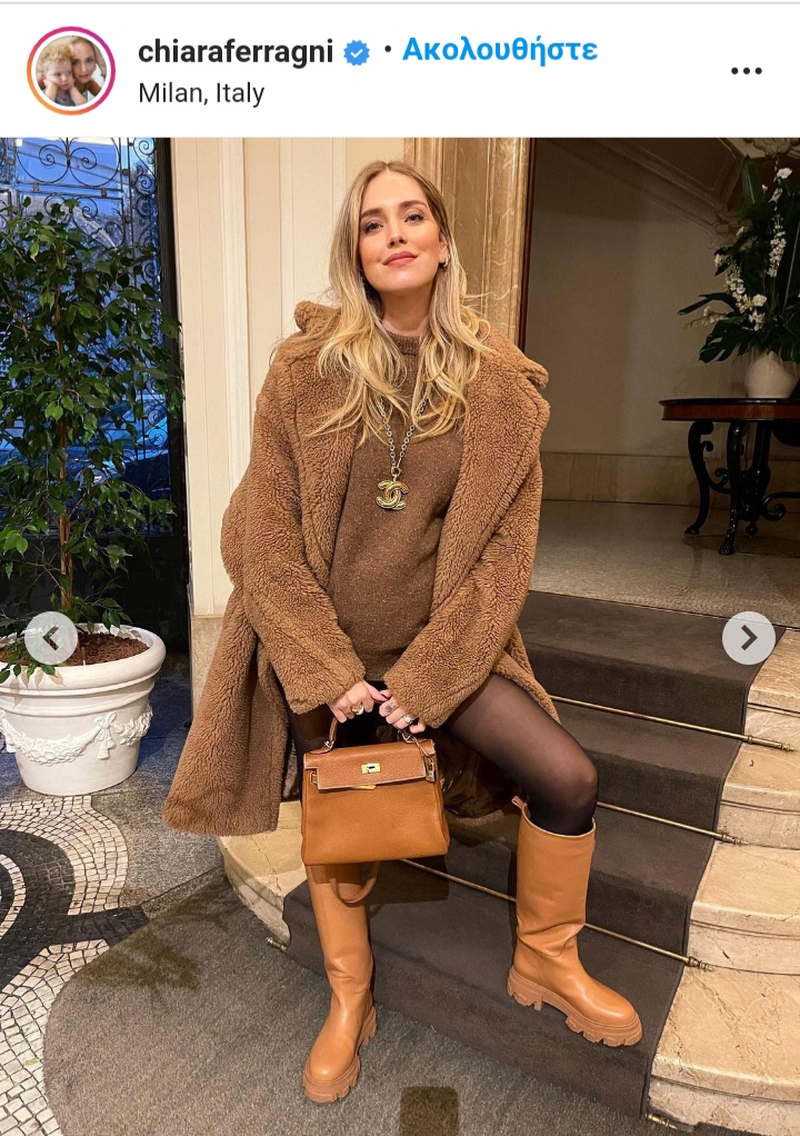 Η Chiara Ferragni σε πρόσφατη εμφάνισή της επένδυσε σε ένα safe look επιλέγοντας ένα teddy coat στις αποχρώσεις του καφέ. Η Ιταλίδα fashion blogger και επιχειρηματίας, το συνδύασε με ένα πλεκτό σετ από μπλούζα και σορτσάκι -που κάλυπτε τη φουσκωμένη κοιλίτσα της αφήνοντας όμως στην κοινή θέα τα καλλίγραμμα πόδια της- λεπτό καλσόν και μπότες με τρακτερωτή σόλα που ενισχύουν το νεανικό ύφος του συνόλου.