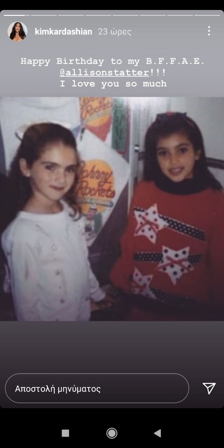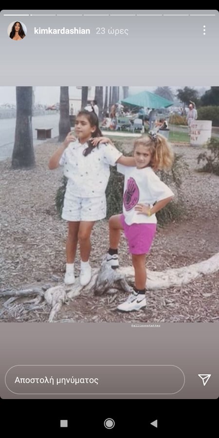 Μάλιστα η Κιμ δεν ξεχνάει να ευχηθεί στους καλυτέρους της φίλους μέσω των social media με παλιές φωτογραφίες τους. Μέσω του stοry της στο προσωπικό της λογαριασμό στο Instagram η Κιμ Καρντάσιαν δημοσίευσε φωτογραφίες από τη τρυφερή της ηλικία με τη καλύτερη της φίλη, Άλισον Στάτερ.