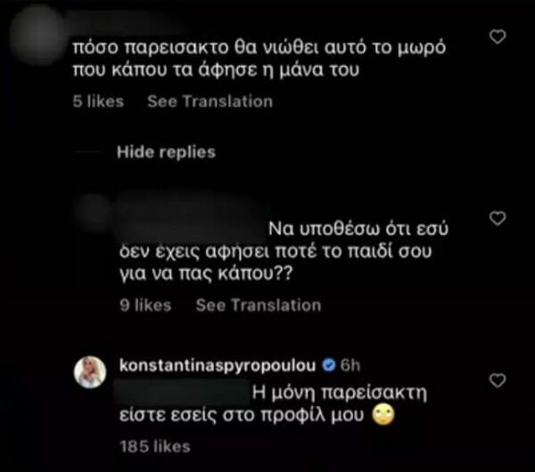 «Πόσο παρείσακτο θα νιώθει αυτό το μωρό που κάπου το άφησε η μάνα του», έγραψε χαρακτηριστικά μία γυναίκα στα social media κάτω από φωτογραφίες που ανάρτησε η Σπυροπούλου.