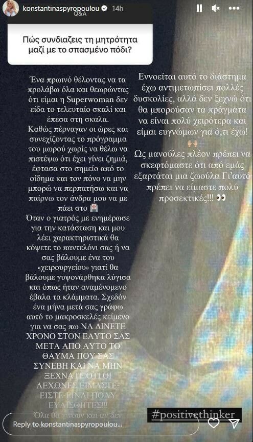 Στον τραυματισμό της λίγο καιρό μετά τη γέννηση του γιου της, μίλησε η Κωνσταντίνα Σπυροπούλου.