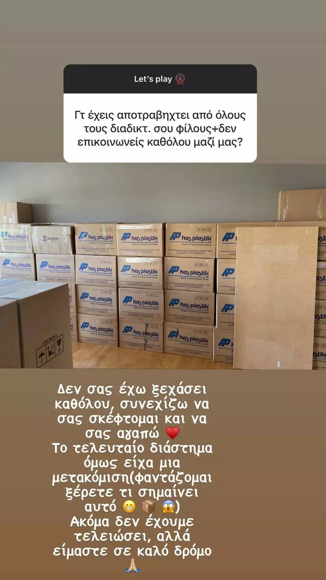 Και η παρουσιάστρια απάντησε: «Δεν σας έχω ξεχάσει καθόλου, συνεχίζω να σας σκέφτομαι και να σας αγαπώ! Το τελευταίο διάστημα όμως είχα μια μετακόμιση (φαντάζομαι ξέρετε τι σημαίνει αυτό).