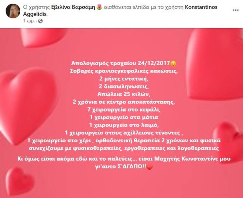Η θεραπεία του Κωνσταντίνου Αγγελίδη συνεχίζεται με γοργούς ρυθμούς και η αγαπημένη του σύζυγος, Εβελίνα Βαρσάμη, η οποία δεν έχει φύγει από το πλευρό του από την πρώτη κιόλας μέρα που έγινε το τροχαίο, έκανε μία πολύ συγκινητική ανάρτηση στον προσωπικό της λογαριασμό στο Facebook.