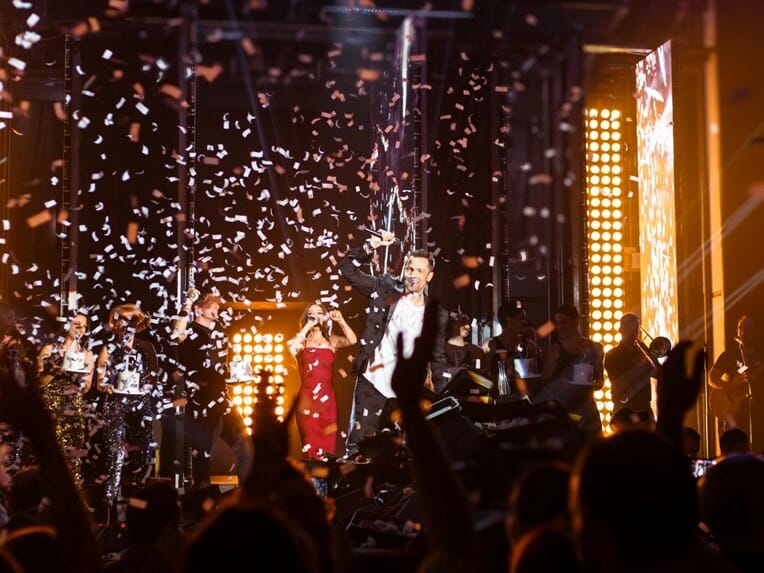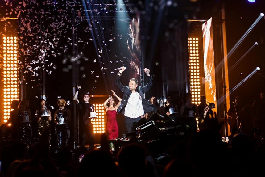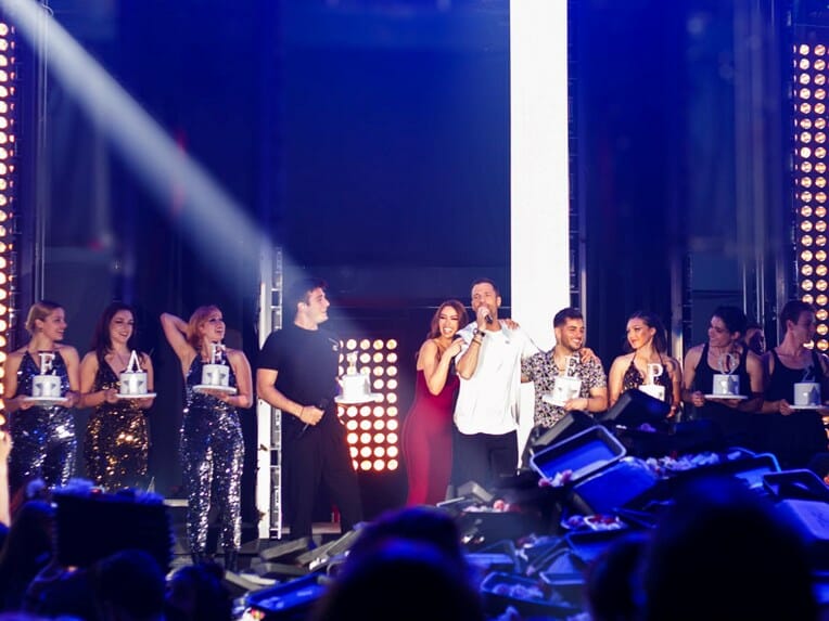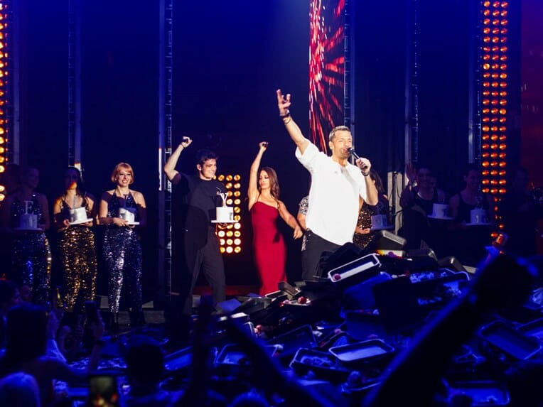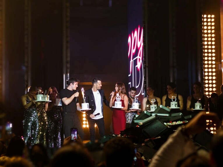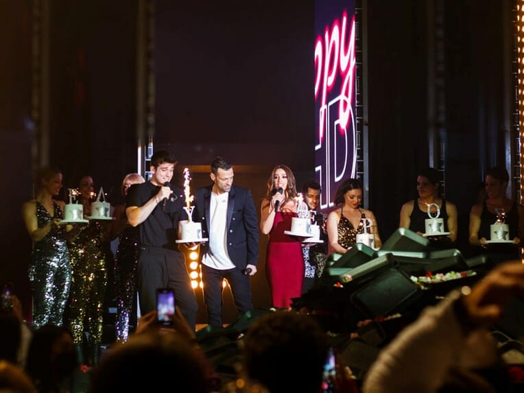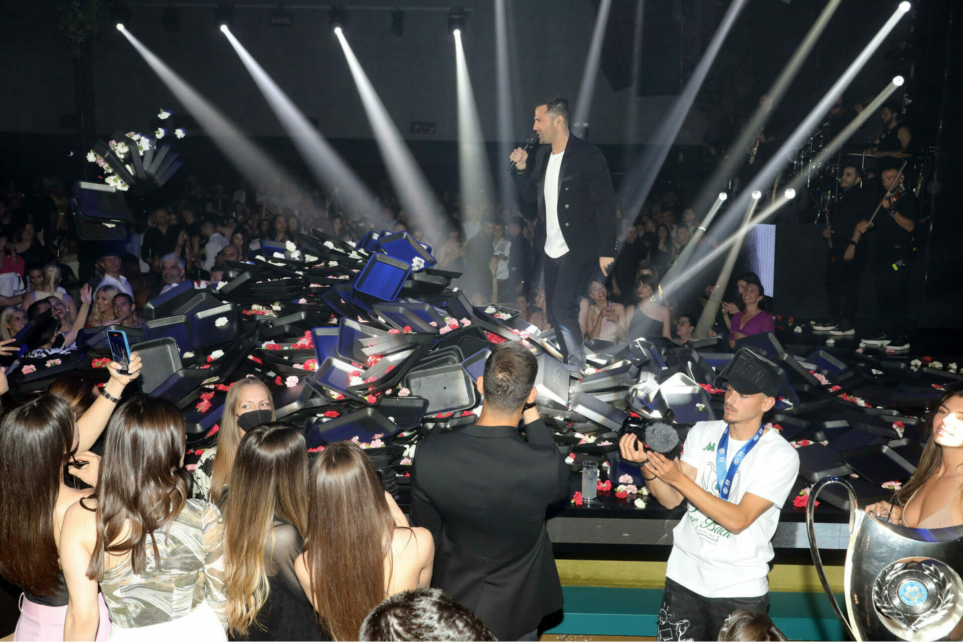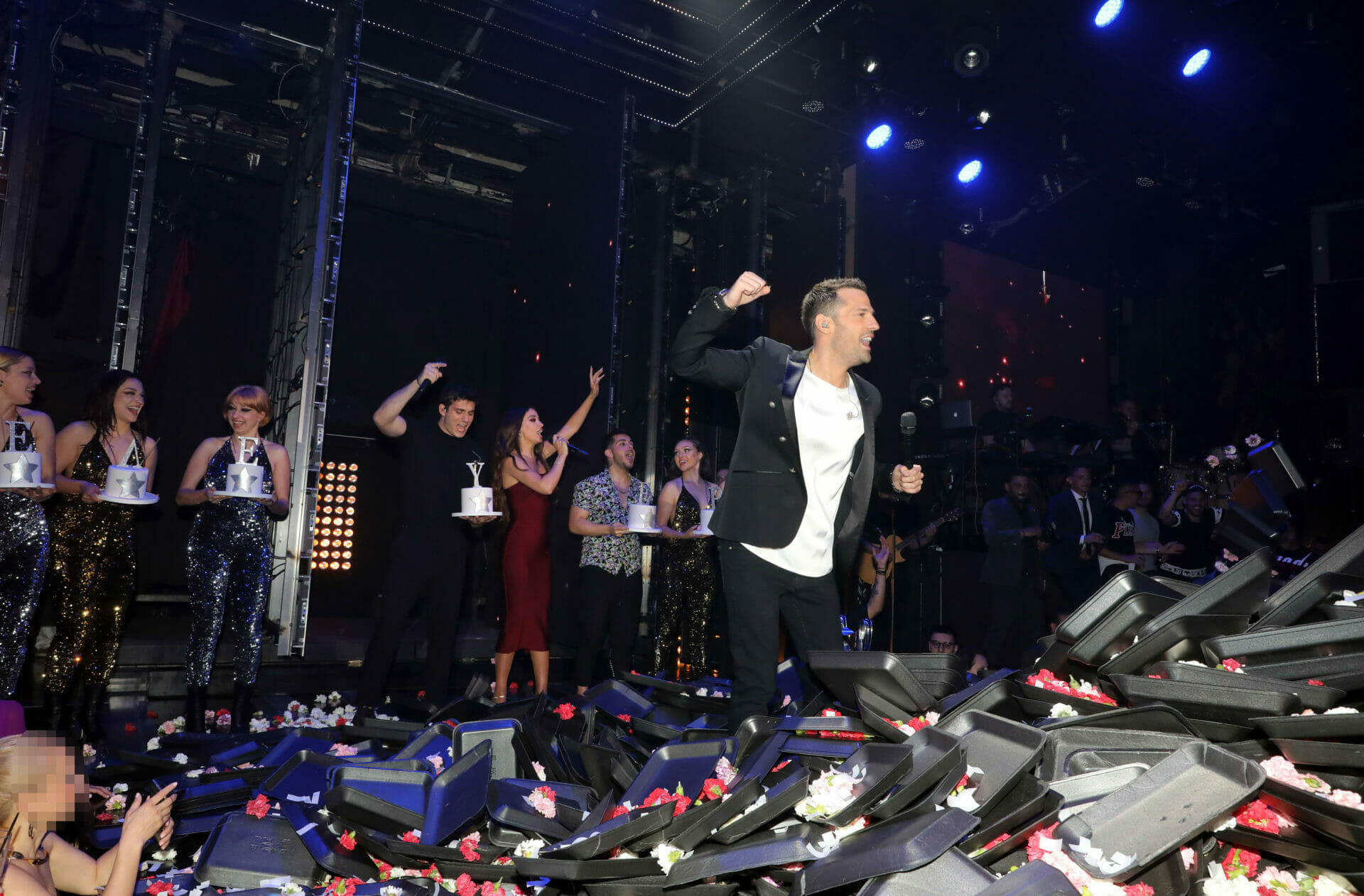 Πιο συγκεκριμένα, ενώ ο τραγουδιστής βρισκόταν στη σκηνή ανέβηκαν οι συνεργάτες του κρατώντας εννιά τούρτες που σχημάτιζαν τη λέξη «Ελεύθερος», που είναι η νέα επιτυχία του.
