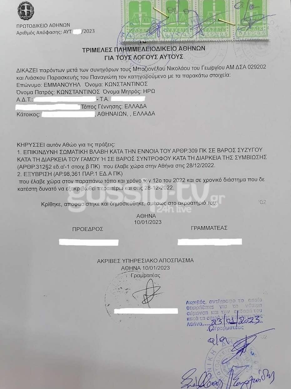 Συγκεκριμένα, σύμφωνα με το έγγραφο που παρουσιάζει κατ’ αποκλειστικότητα το gossip-tv, ο πρώην παίκτης του Survivor και make up artist αθωώθηκε όπως αναφέρει το δικόγραφο, για τις κατηγορίες επικίνδυνης σωματικής βλάβης σε βάρος συζύγου κατά τη διάρκεια του γάμου ή σε βάρος συντρόφου κατά τη διάρκεια συμβίωσης αλλά και εξύβρισης.