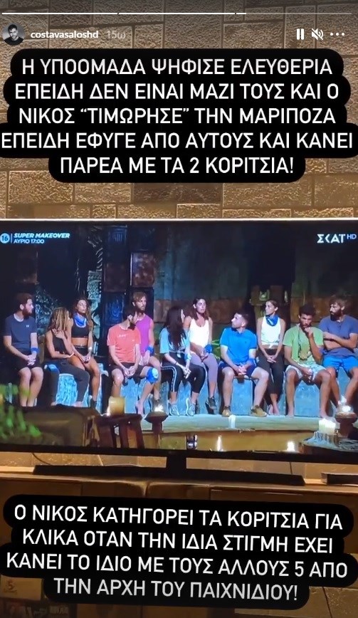 Ο Νίκος κατηγορεί τα κορίτσια για κλίκα. Όταν την ίδια στιγμή έχει κάνει το ίδιο με τους άλλους 5 από την αρχή του παιχνιδιού.». Αυτό έγραψε χαρακτηριστικά ο Κωνσταντίνος Βασάλος, “καρφώνοντας” τον παίκτη της μπλε ομάδας.