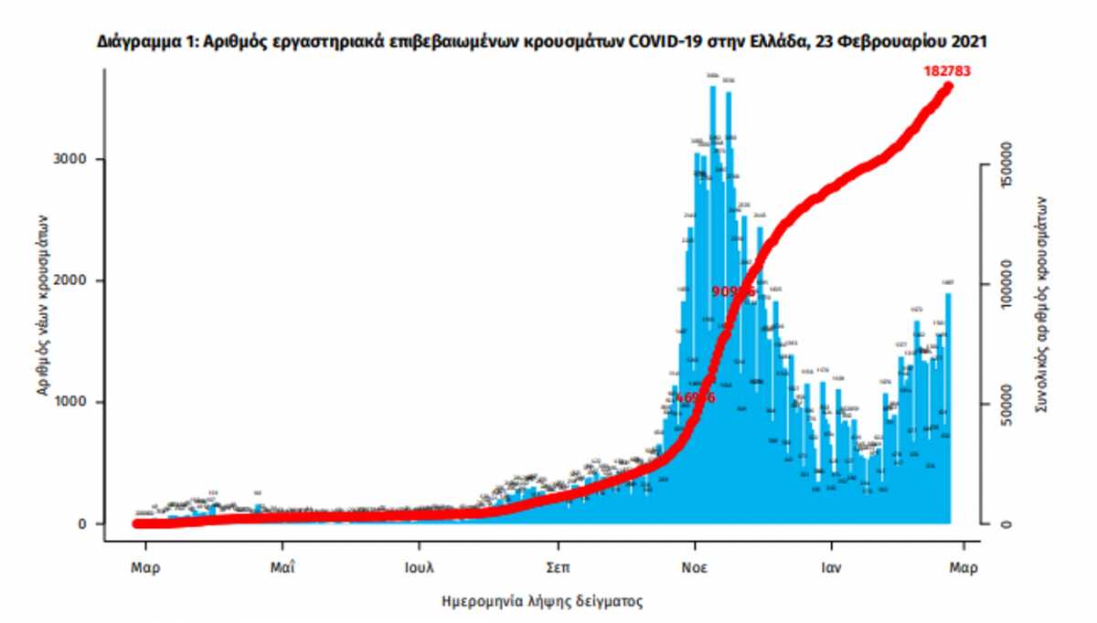 Τα νέα εργαστηριακά επιβεβαιωμένα κρούσματα της νόσου που καταγράφηκαν τις τελευταίες 24 ώρες είναι 2.147, εκ των οποίων 16 εντοπίστηκαν κατόπιν ελέγχων στις πύλες εισόδου της χώρας. Ο συνολικός αριθμός των κρουσμάτων ανέρχεται σε 182.783 (ημερήσια μεταβολή +1.2%), εκ των οποίων 51.8% άνδρες.