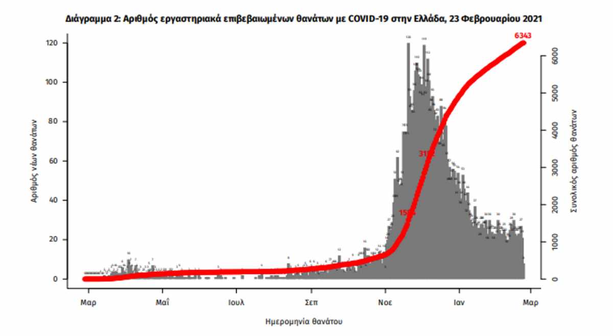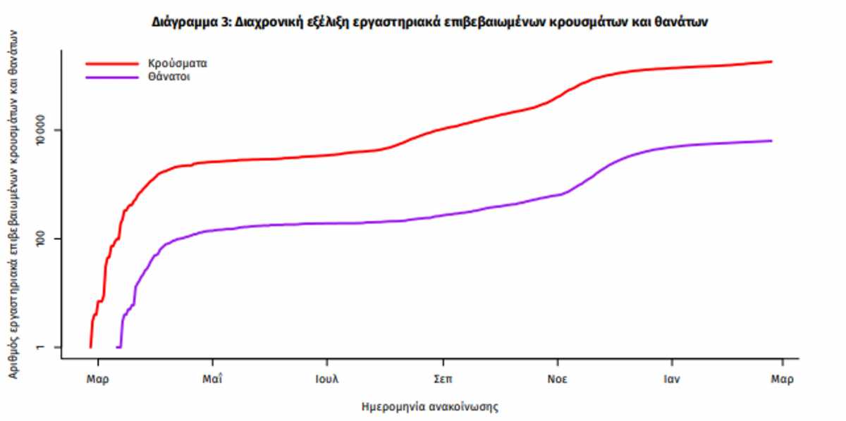Η διαχρονική εξέλιξη των συνολικών κρουσμάτων και συνολικού αριθμού των θανάτων ασθενών COVID-19 παρουσιάζεται στο ακόλουθο διάγραμμα.