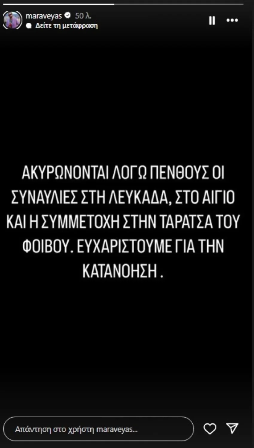 «Ακυρώνονται λόγω πένθους οι συναυλίες στη Λευκάδα, στο Αίγιο και η συμμετοχή στην ταράτσα του Φοίβου. Ευχαριστούμε για την κατανόηση», αναφέρει στο μήνυμά του ο Κωστής Μαραβέγιας, χωρίς να κάνει γνωστό να αποκαλύπτει περισσότερες λεπτομέρειες.