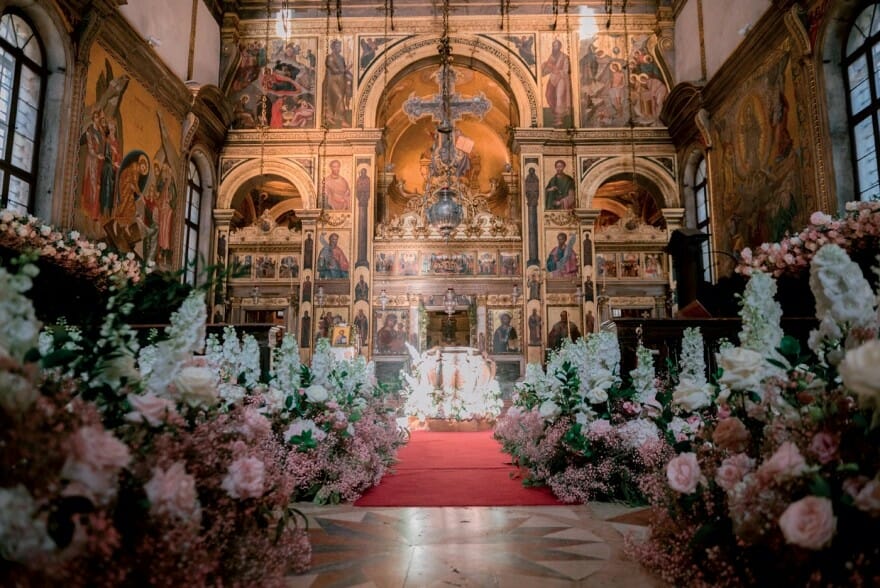Ο εφοπλιστής Γιάννης Κούστας και η σύζυγός του Δήμητρα Μέρμηγκα επέλεξαν το μυστήριο να λάβει χώρα στην εκκλησία του Αγίου Γεωργίου των Ελλήνων στη Βενετία. Είναι η παλαιότερη ορθόδοξη ελληνική εκκλησία στη Δύση.