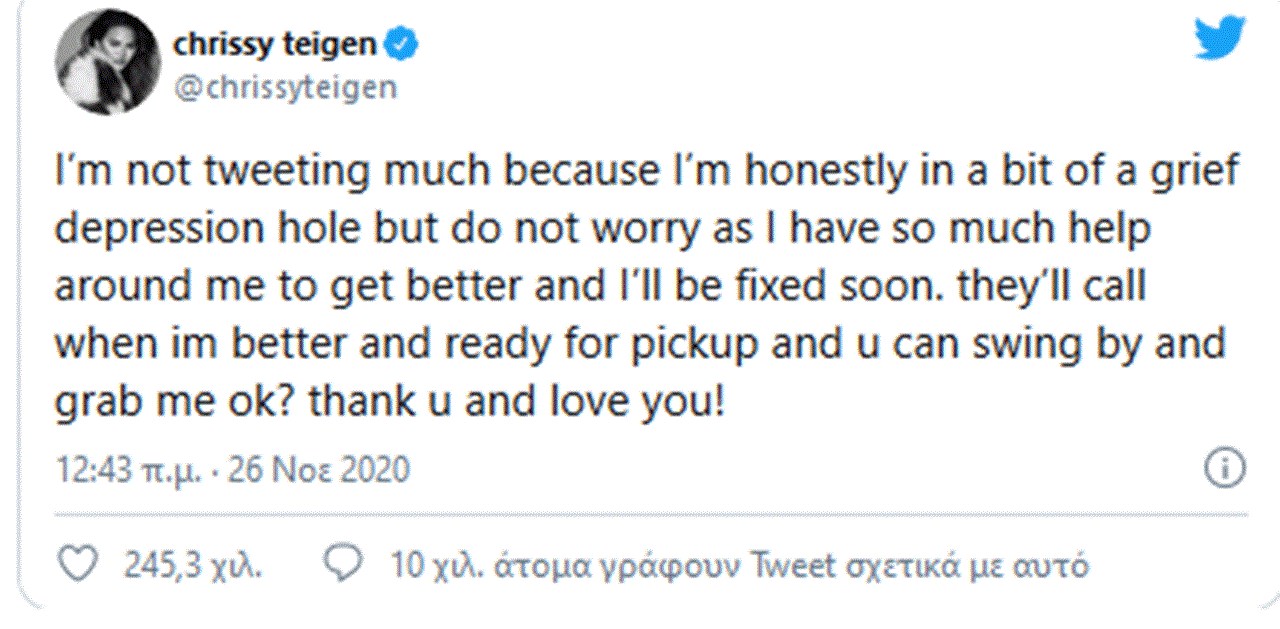 «Δεν κάνω πολλά tweet γιατί έχω πέσει στην τρύπα της κατάθλιψης, αλλά μην ανησυχείτε καθώς έχω τόση βοήθεια γύρω μου για να γίνω καλύτερα και θα γίνω σύντομα καλύτερα», έγραψε στο Twitter.