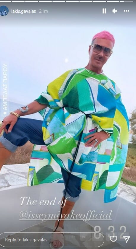 Ο Λάκης Γαβαλάς, θέλοντας να τιμήσει τη μνήμη του, φόρεσε μία από τις δημιουργίες του και φωτογραφήθηκε με αυτήν. Μάλιστα έγραψε στην ανάρτηση που πραγματοποίησε στα stories του, «Το τέλος του Issey Miyake».