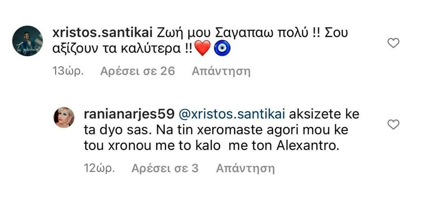 Όπως φάνηκε από τον σύντομο διάλογο που είχαν στο instagram η Λάουρα Νάργες και ο Χρήστος θα την καεί το όνομα του παιδιού τους είναι Αλέξανδρος.