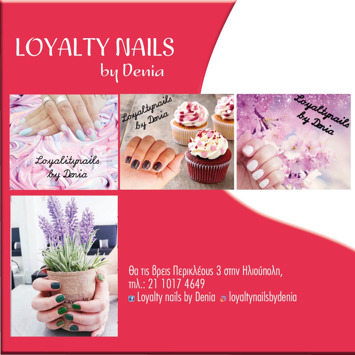 Το κατάστημα Loyalty nails by Denia βρίσκεται στην Ηλιούπολη στην οδό Περικλέους. Ενας σύγχρονος χώρος υψηλής αισθητικής που προσφέρει όλες τις υπηρεσίες για μια ημερα περιποίησης . Manicure, pedicure, τεχνητά νύχια, ημιμόνιμο, αποτρίχωση, σχηματισμός φρυδιών, τοποθέτηση βλεφαρίδων και μακιγιάζ, συνθέτουν το απόλυτο πακέτο ομορφιάς.