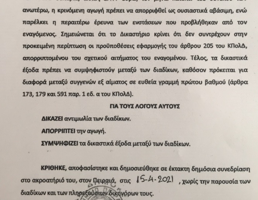 Αποτέλεσμα όλων των παραπάνω ήταν το Μονομελές Πρωτοδικείο Πειραιά να αποφασίσει στις 15 Απριλίου 2021, ότι ο Λουκάς Νομικός δεν είναι πλέον αναγκασμένος να πληρώνει διατροφή στην ενήλικη κόρη του.