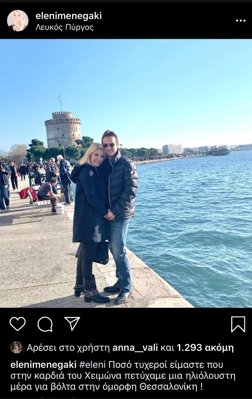 Έκανε μόνη της τον παπαράτσι και τίναξε το instagram η Ελένη Μενεγάκη. Η παρουσιάστρια φρόντισε να συνδυάσει δουλειά και ολιγοήμερη απόδραση αλλά δεν ήταν μόνη. Στο ταξίδι αυτό ταξίδεψε και ο σύζυγός της, Μάκης Παντζόπουλος. Οι δυο τους βρήκαν χρόνο για να απολαύσουν τις ομορφιές της Θεσσαλονίκης και με σύμμαχο τους τον καιρό, κατάφεραν να χαλαρώσουν από τα πιεστικά προγράμματα και να ποζάρουν ακόμη και στον δικό του φωτογραφικό φακό. Δεν ειναι η πρωτη φορά που η Ελένη κάνει τον παπαράτσι του εαυτού της. Είναι όμωσ μια ακόμη φπρά που δημοσίευσε μια φωτογραφία στον προσωπικό της λογαριασμό στο Instagram και τα like πέφτουν βροχή. «Πόσο τυχεροί είμαστε που στην καρδιά του χειμώνα πετύχαμε μια ηλιόλουστη μέρα για βόλτα στην όμορφη Θεσσαλονίκη» έγραψε στη λεζάντα η Ελένη Μενεγάκη ποζάροντας μπροστά από τον Λευκό Πύργο.