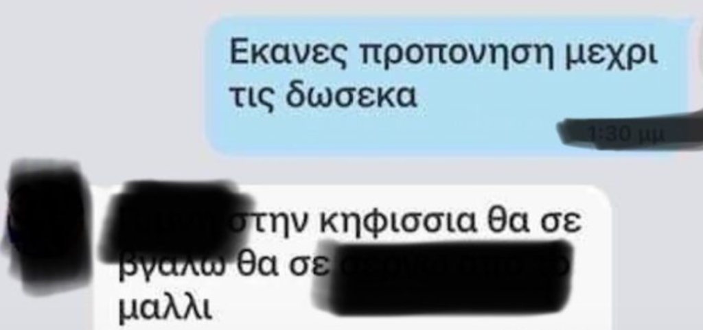Σύμφωνα με την καταγγέλλουσα, την απειλεί με γραπτά μηνύματα, τα οποία η ίδια έχει καταθέσει στη μηνυτήρια αναφορά της. Ενώ και η ίδια απαντά με υβριστικό τρόπο στον καταγγελλόμενο, γεγονός που επιβεβαιώνει ότι το κλίμα μεταξύ των δυο πρώην συντρόφων, πριν το περιστατικό, ήταν εκρηκτικό.