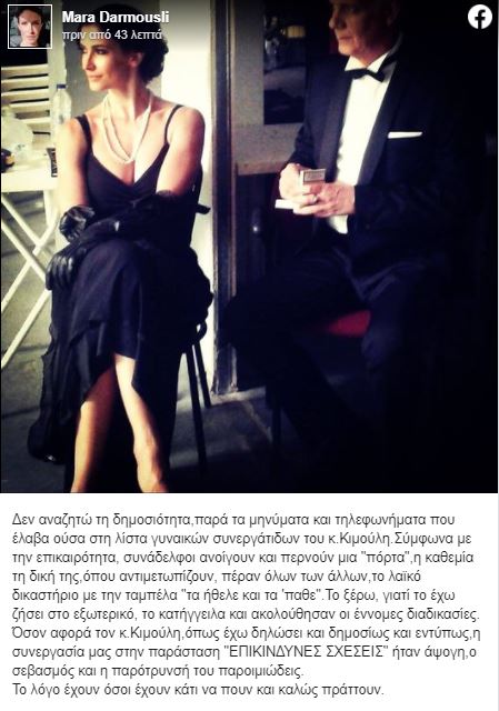 «Δεν αναζητώ τη δημοσιότητα, παρά τα μηνύματα και τηλεφωνήματα που έλαβα ούσα στη λίστα γυναικών συνεργάτιδων του κ.Κιμούλη. Σύμφωνα με την επικαιρότητα, συνάδελφοι ανοίγουν και περνούν μια “πόρτα”, η καθεμία τη δική της, όπου αντιμετωπίζουν, πέραν όλων των άλλων, το λαϊκό δικαστήριο με την ταμπέλα “τα ήθελε και τα ‘παθε”. Το ξέρω, γιατί το έχω ζήσει στο εξωτερικό, το κατήγγειλα και ακολούθησαν οι έννομες διαδικασίες. Όσον αφορά τον κ.Κιμούλη, όπως έχω δηλώσει και δημοσίως και εντύπως, η συνεργασία μας στην παράσταση “ΕΠΙΚΙΝΔΥΝΕΣ ΣΧΕΣΕΙΣ” ήταν άψογη, ο σεβασμός και η παρότρυνσή του παροιμιώδεις. Το λόγο έχουν όσοι έχουν κάτι να πουν και καλώς πράττουν» έγραψε σε ανάρτησή της η Μάρα Δαρμουσλή.