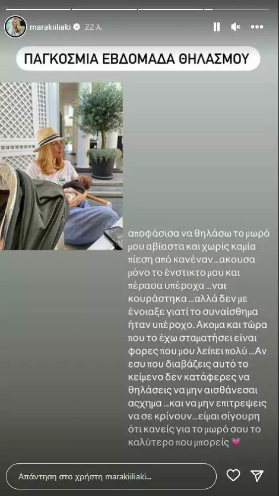 Mε αφορμή την Παγκόσμια Εβδομάδα Θηλασμού η Μαρία Ηλιάκη προχώρησε σε ανάρτηση μέσω Instagram stories και έστειλε το μήνυμά της στους διαδικτυακούς της φίλους αναφερόμενη στην εμπειρία της με τον θηλασμό της κόρης της.