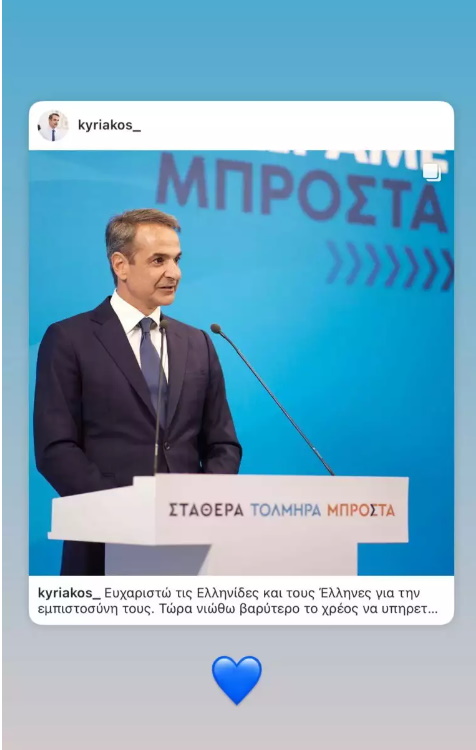 Η αθλήτρια έκανε retweet το ποστάρισμα του Μητσοτάκη μετά την ολοκλήρωση των εκλογών, στο οποίο ευχαριστούσε τους ψηφοφόρους για τη στήριξή τους και το συνόδευσε με μία μπλε καρδούλα.