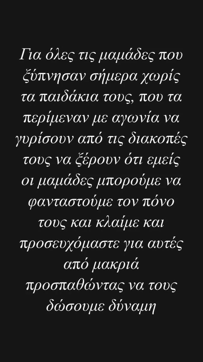 Μέσω ανάρτησης που έκανε στα stories του προσωπικού της λογαριασμό στο Instagram, απευθύνθηκε στις μητέρες που έχασαν τα παιδιά τους από τη σύγκρουση των τρένων στα Τέμπη, γράφοντας τα εξής: