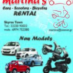 Ανακαλύψτε την πανέμορφη Σκύρο με ενοικιαζόμενο αυτοκίνητο, scooter ή ποδήλατο από το Martina’s rental, που λειτουργεί από το 1986. Βρίσκεται στη Άνω Eίσοδο της Χώρας, δίπλα στο φούρνο του χωριού και το αστυνομικό τμήμα. Η παράδοση και η παραλαβή των οχημάτων μπορεί να γίνει σε όλο το νησί. Παρέχονται επίσης και δωρεάν παιδικά καθίσματα αυτοκινήτων ώστε να κάνουν την διαμονή σας όσο καλύτερη και ξένοιαστη γίνεται καθώς και κράνη για τα μηχανάκια ώστε να είστε πάντα ασφαλείς και να έχετε το κεφάλι σας ήσυχο. Τέλος ο χάρτης του νησιού δίνεται δώρο από το κατάστημα ώστε να έχετε την ευκαιρία να ανακαλύψετε όλες τις ομορφιές του νησιού και να φτάσετε εύκολα κοντά τους.