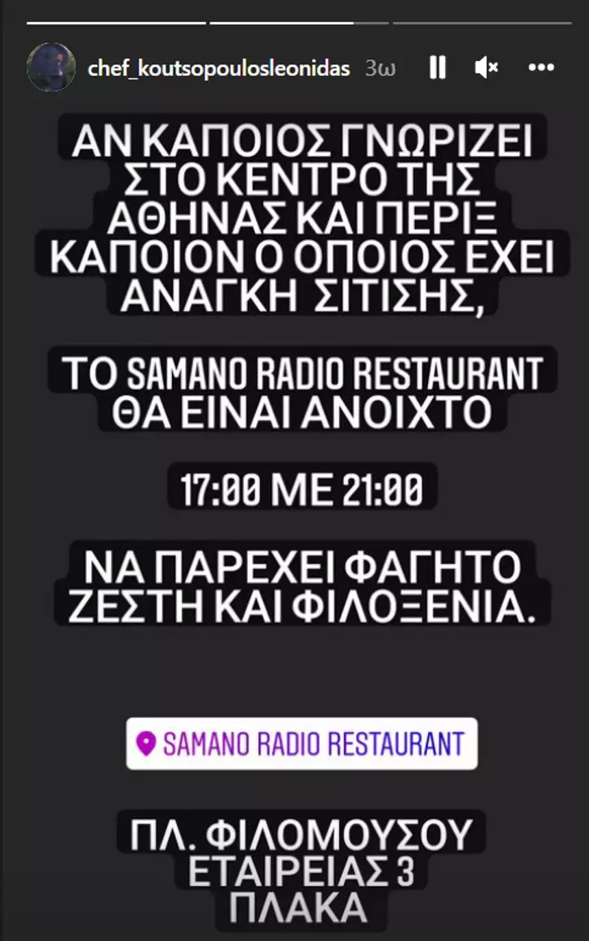 «Αν κάποιος γνωρίζει στο κέντρο της Αθήνας και στα πέριξ κάποιον ο οποίος έχει ανάγκη σίτισης, το Samano Radio Restaurant θα είναι ανοιχτό 17:00-21:00 να παρέχει φαγητό, ζέστη και φιλοξενία». Έγραψε στο story που δημοσίευσε στο Instagram για να βοηθήσει όποιον έχει ανάγκη.
