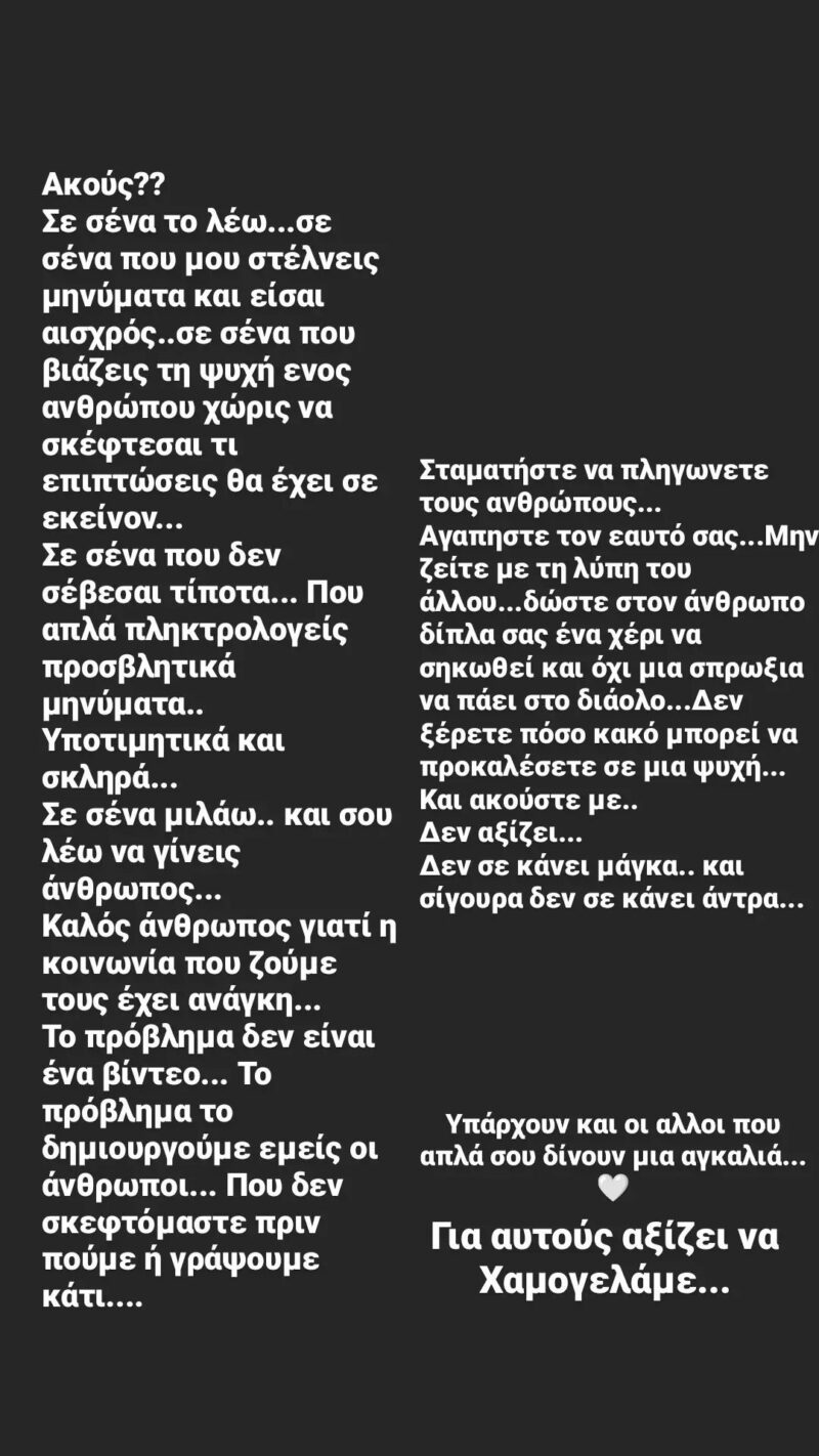 Η οποία αποφάσισε να ανεβάσει ένα story στο Instagram για να βάλει στη θέση τους όλους εκείνους που την κατακρίνουν και την προσβάλουν.