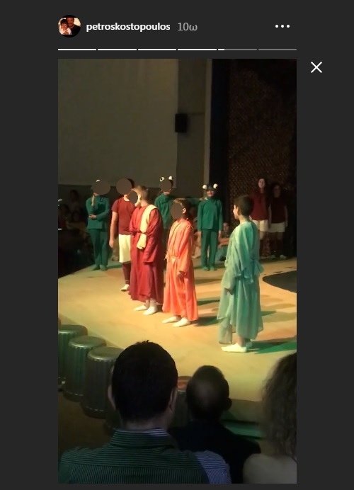 Oι μαθητές έπαιξαν για τους γονείς την παράσταση «Βάτραχοι» του Αριστοφάνη και ο Μάξιμος ήταν ανάμεσα στους μικρούς πρωταγωνιστές, με τον παρουσιαστή να μη σταματά να τον τραβάει με το κινητό του! Αλίμονο, το πώς ήθελε ο «θείος Πέτρος» αγόρι, άλλο να σας το λέμε, άλλο να το ζείτε.