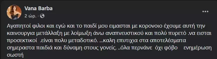 «Αγαπητοί φίλοι και εγώ και το παιδί μου είμαστε με κορονοϊό έχουμε αυτή την καινούργια μετάλλαξη, με λοίμωξη άνω αναπνευστικού και πολύ πυρετό. Να είστε προσεκτικοί .είναι πολύ μεταδοτικό. …καλή επιτυχία στα αποτελέσματα σήμερα στα παιδιά και δύναμη στους γονείς… όλα περνάνε, όχι φόβο, ενημέρωση σωστή» έγραψε η Βάνα Μπάρμπα.