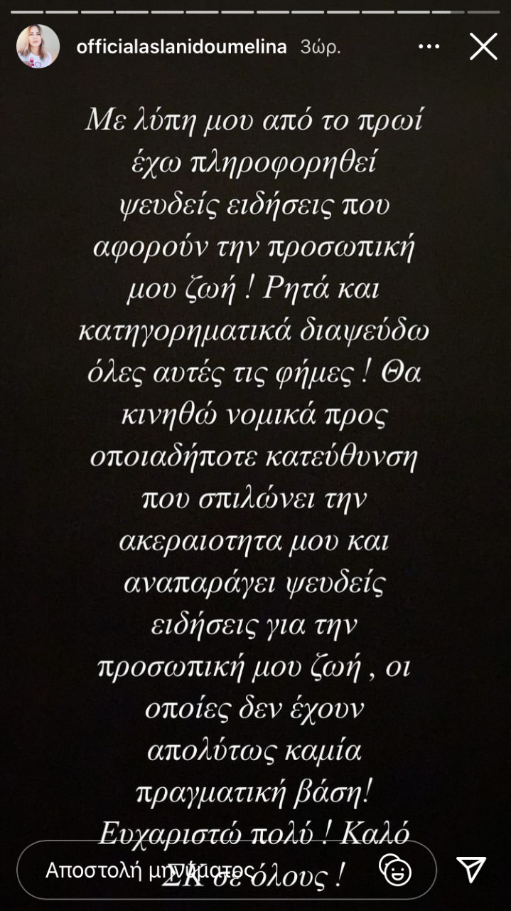 «Με λύπη μου από το πρωί έχω πληροφορηθεί ψευδείς ειδήσεις που αφορούν την προσωπική μου ζωή! Ρητά και κατηγορηματικά διαψεύδω όλες αυτές τις φήμες! Θα κινηθώ νομικά προς οποιαδήποτε κατεύθυνση που σπιλώνει την ακεραιότητα μου και αναπαράγει ψευδείς ειδήσεις για την προσωπική μου ζωή, οι οποίες δεν έχουν απολύτως καμία πραγματική βάση! Ευχαριστώ πολύ! Καλό ΣΚ σε όλους!».