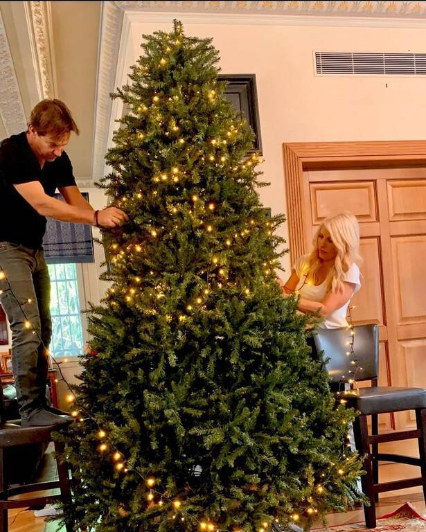 Η παρουσιάστρια ανέβασε δύο φωτογραφίες της με τον σύζυγό της Μάκη Παντζόπουλο την ώρα που στόλιζαν το πανύψηλο χριστουγεννιάτικο δέντρο στο σπίτι τους στα Μελίσσια.