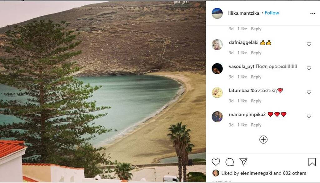 Η Ελένη Μενεγάκη λατρεύει το νησί, έχει δημοσιεύει αρκετές φωτογραφίες και μας έχει δείξει τις ομορφιές του. Το ίδιο βέβαια και ο σύζυγός της, Μάκης Παντζόπουλος αλλά και η πεθερά της Λιλίκα Μαντζίκα Παντζοπούλου που είναι ενργή στο instagram!