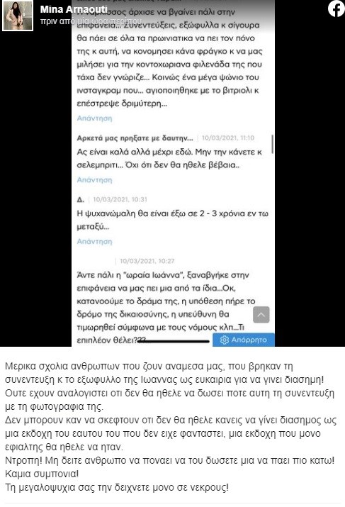 Ντροπή! Μη δείτε άνθρωπο να πονάει να του δώσετε μια να πάει πιο κάτω! Καμιά συμπόνια! Τη μεγαλοψυχία σας την δείχνετε μόνο σε νεκρούς», έγραψε η Μίνα Αρναούτη.